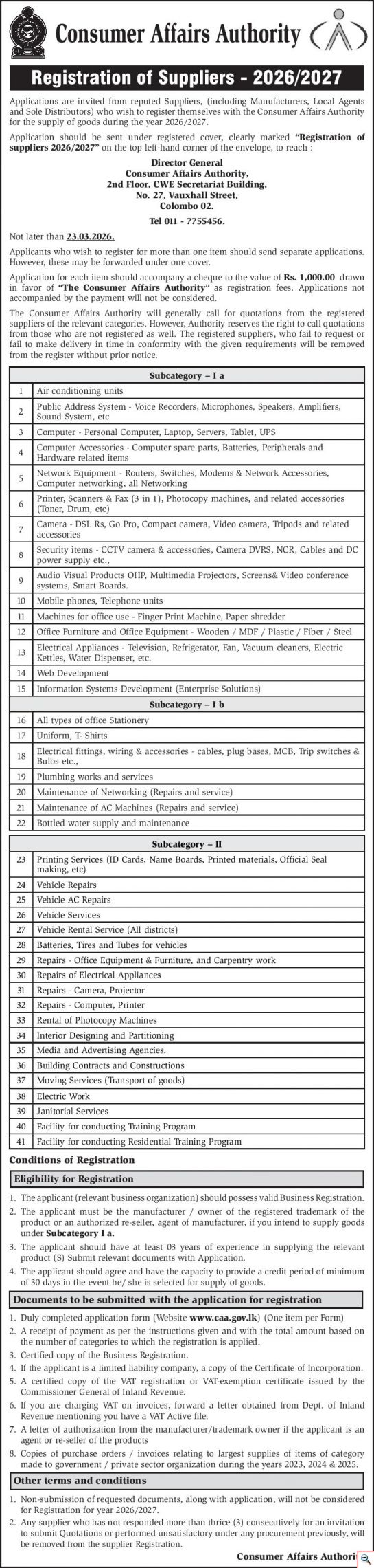 Registration of Suppliers 2026 2027 Closing Date of Submission 23-03-2026 Application Form
