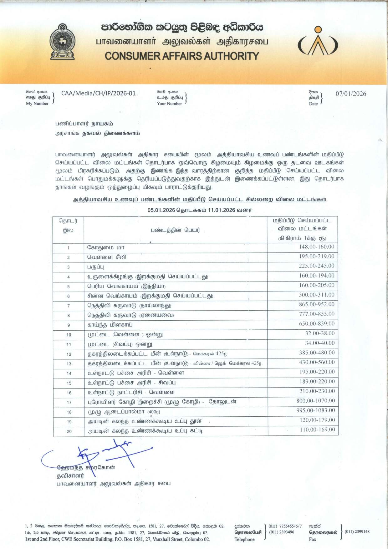 Indicative Prices of Selected Essential Food Commodities 07 January 2026