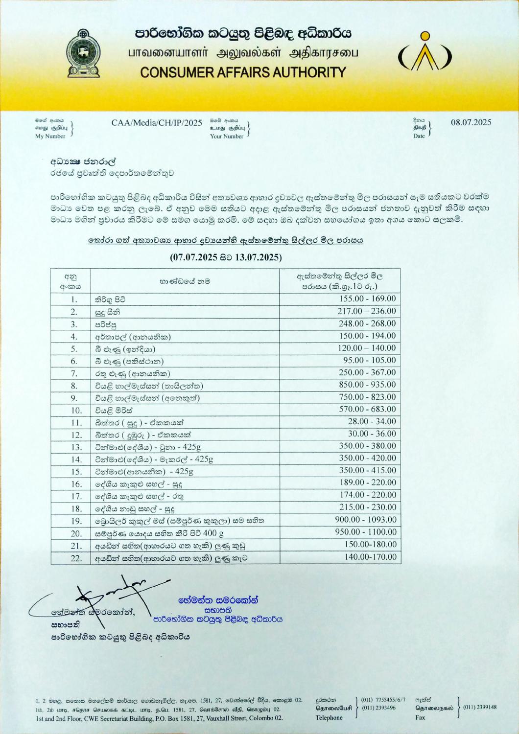 Indicative Prices of Selected Essential Food Commodities 08 July 2025