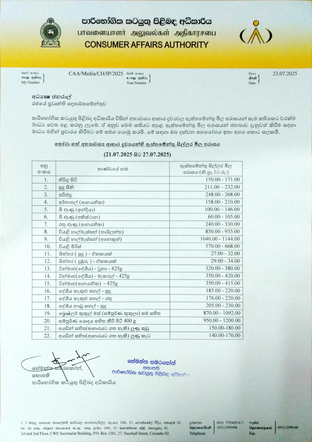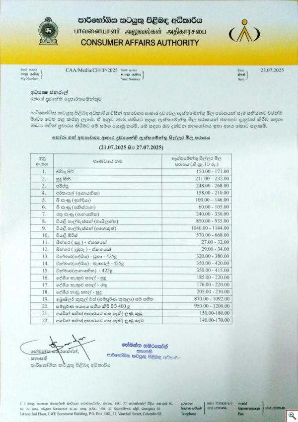 Indicative Prices of Selected Essential Food Commodities 23 July 2025